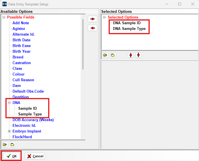 - Double click on the DNA field heading, or click the " + " to expand out the sub-options, and use the arrows to move the sub fields (Sample ID and Sample Type) to Selected Options.