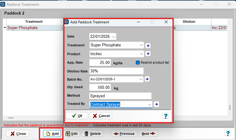 Treatment - Select from dropdown list. You can add a new paddock treatment to the list via the + button