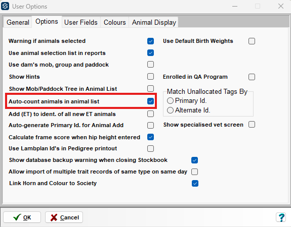 Stockbook will automatically give you a count of the number of animals displayed. To turn off the automatic animal counter Go to Setup User Options Options Untick 'Auto-count animals in animal list If the Auto-count is switched off, the List ...