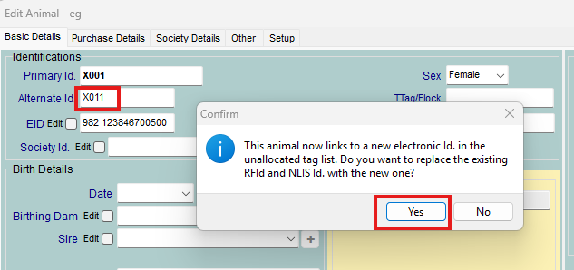 ' This animal now links to a new electronic ID. in the unallocated tag list. Do you want to replace the existing RFID and NLIS Id. with the new one?'