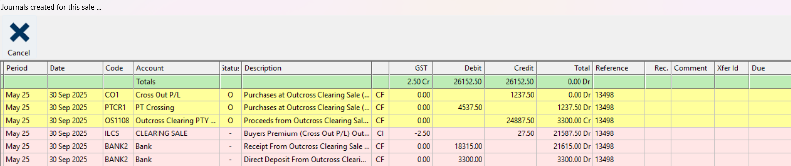 For those using the Stockyard Account module, all the required journals are then generated depending on when you process your sale. If all payments are recorded in the clearing sale then only the journals required for the bank reconciliation are created. If some payments are not taken on the day then these amounts can be added to the client's ledger when the sale is processed.