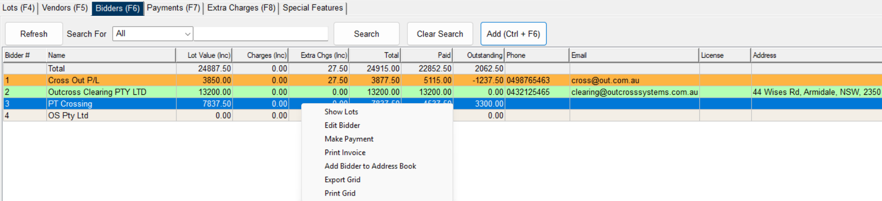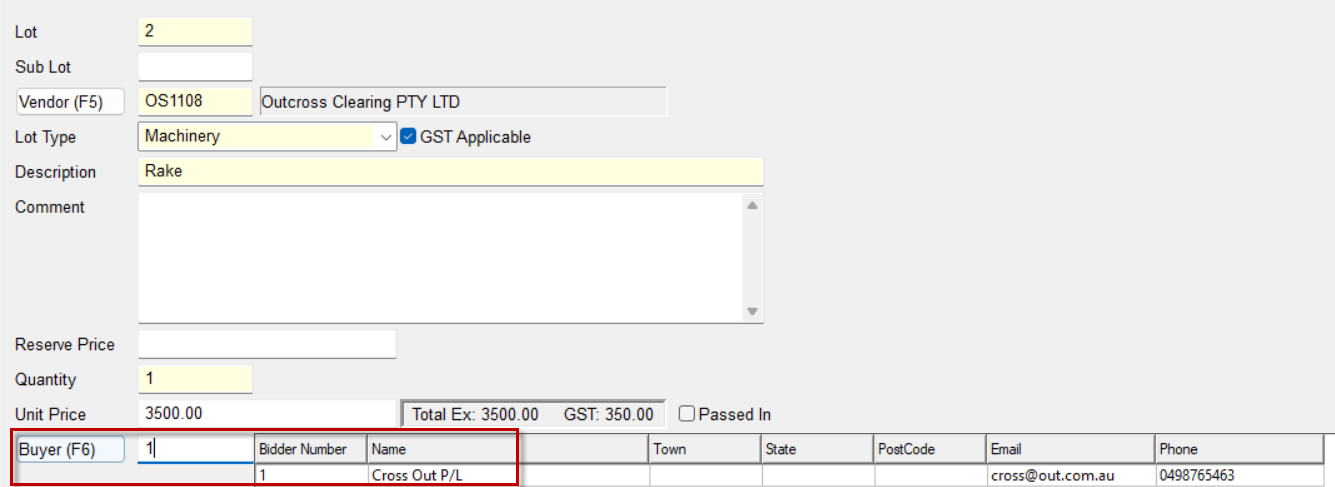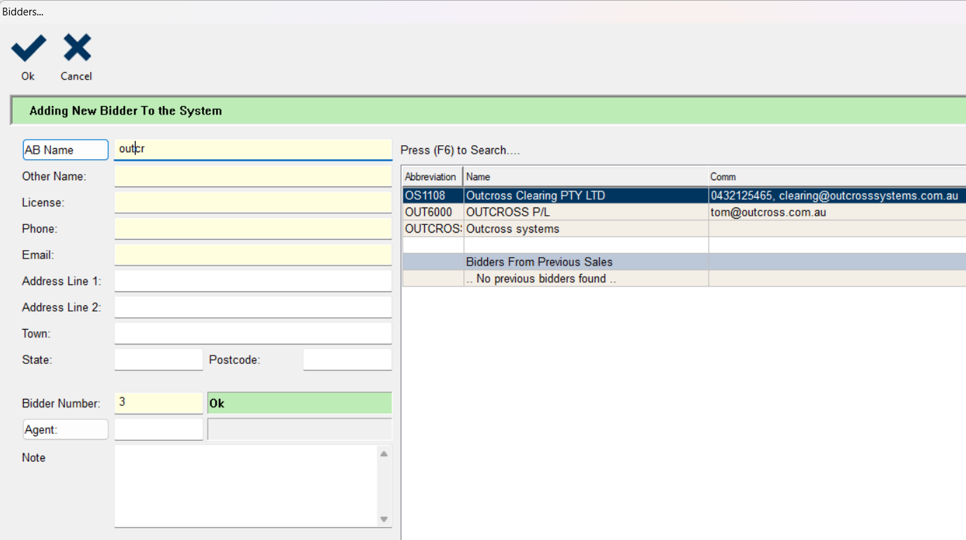 It is important to check that existing contact details have been correctly added to the Bidder record before you process and close the sale, duplicate ledgers and contact might otherwise be created.