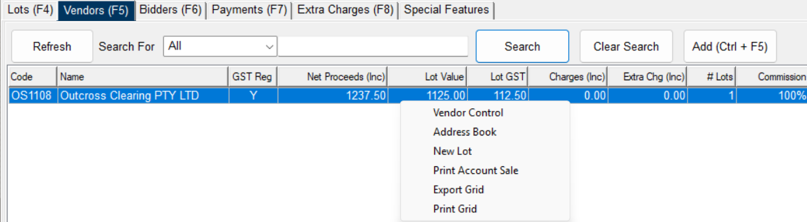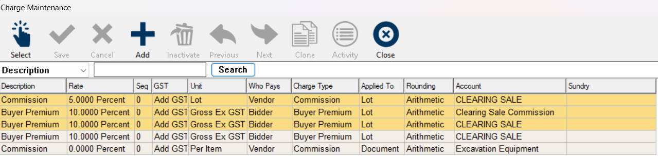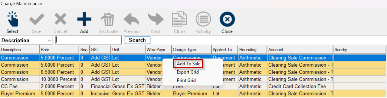 Add the Sales Charges you are aware of before the sale starts eg commission and buyer's premium by right clicking on the charge.