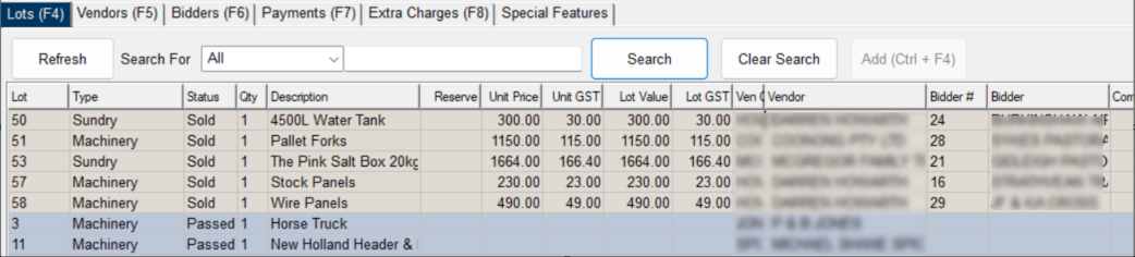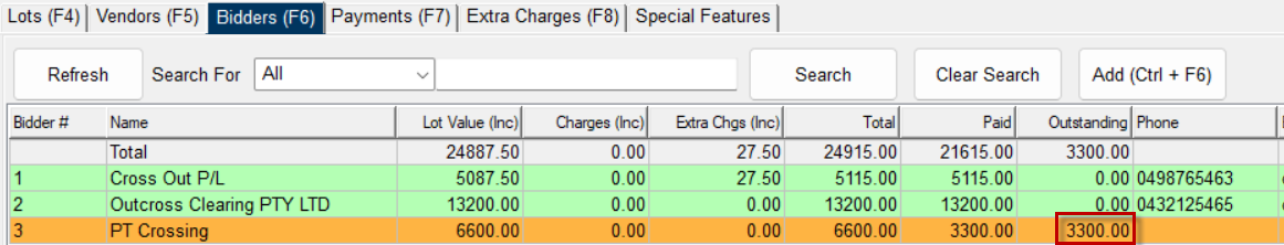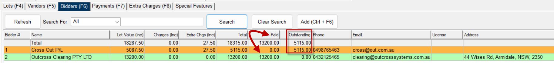 The Bidders tab has two functions. It has the summary details of all bidders and is also where the payment process is performed.