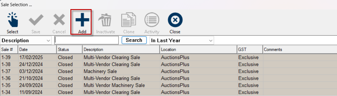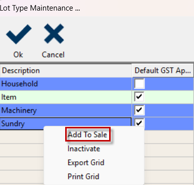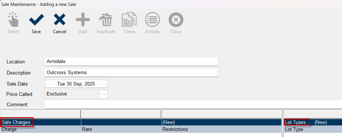 Unlike Livestock, there is no template to create a sale from each time. As clearing sales are typically all very different in content, each new sale needs to have the lot types and charges added as required.