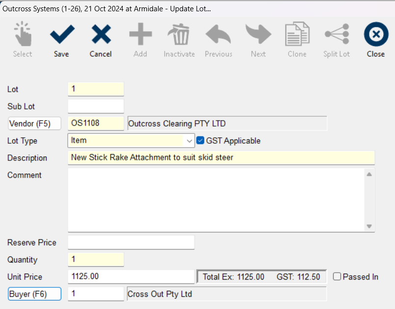 - The Pre Sale button allows the lot and vendor details to be added before the sale.