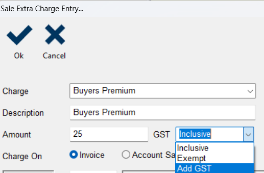 Extra charges display as GST Inclusive but can be set up as Add GST or GST Exempt, depending on how you are calculating your charge.