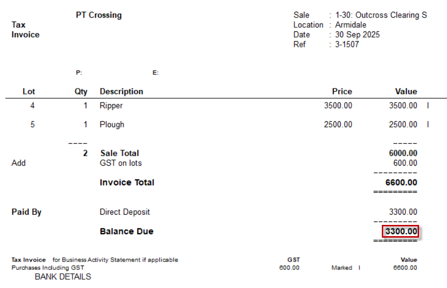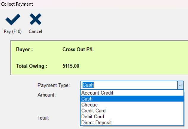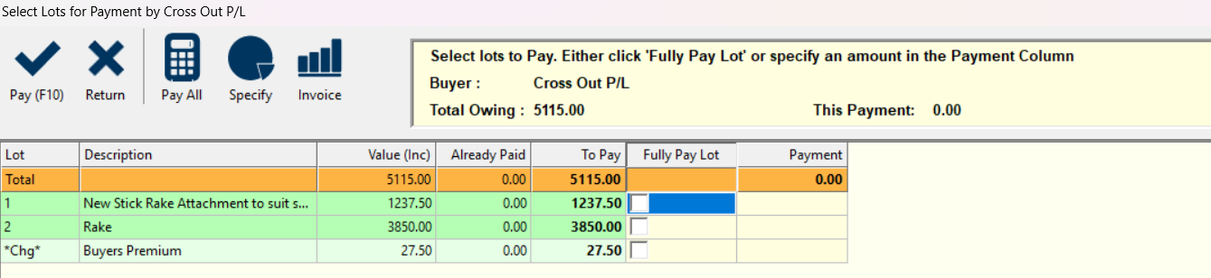 Full or part payments can be made. Use Specify for amounts that are not fully paid, or tick the box for an amount that directly corresponds with a lot total.