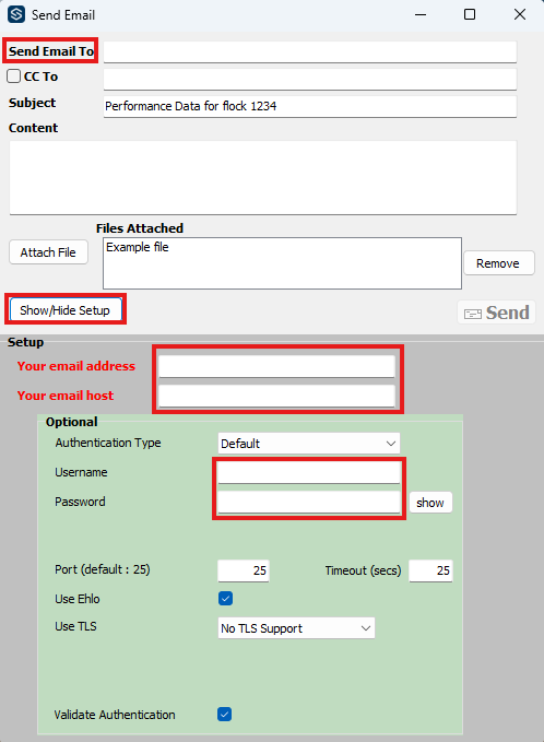 Select Show/Hide setup and this will show the email parameters that need to be correct to send the email