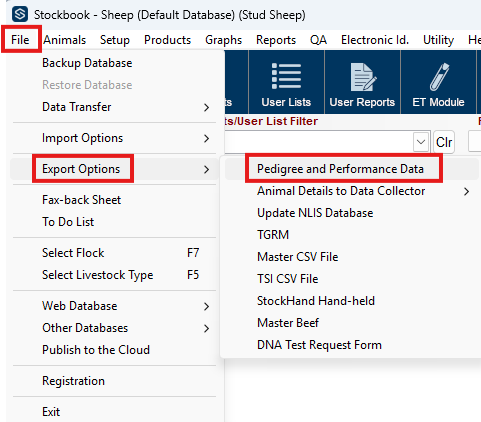 Exporting Data to Sheep Genetics Step 1. Select Pedigree and Performance Data menu option Click on the File > Export Options > Pedigree and Performance Data menu option. If this option does not show up, ensure you have selected the sheep society. You ...