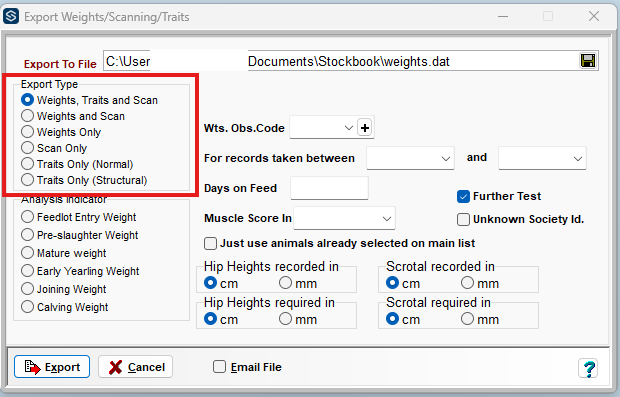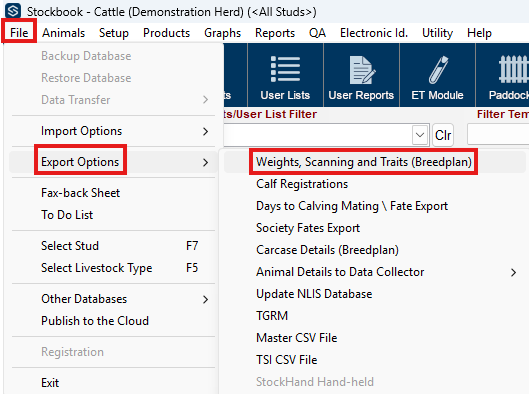 Go to File Export options Weights, Scanning and Traits (Breedplan)3. Select the Export Type