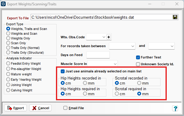 - In this window choose to export the Scrotal as recorded in mm instead of cm.