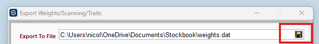 Select Export Select Yes to Confirm message: 'Export weights/traits to C:\.....\.....\Stockbook\weights.dat?' Select Yes to Confirm message: 'Do you want to include a printout with the export (recommended)?' Select OK to Information message 'Export Complete.'You can now email the save file to ABRI/Breedplan You can now email the save file to ABRI/Breedplan Tick the Email File box in Step 3, if you want the file to be sent directly by email.- You will be notified if any of the animals you have chosen do not have a weight of the specified type.