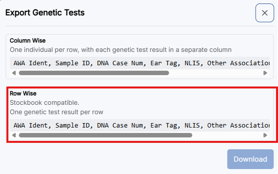 - Select Genetic Test > Export CSV > choose the Stockbook compatible option > Download for genetic test results.