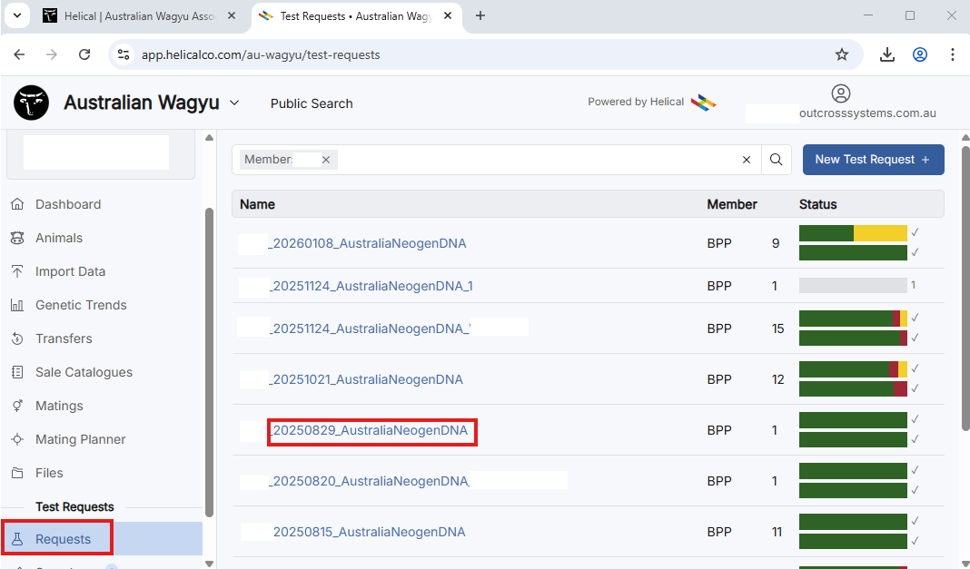 - Go to Test Requests > Requests. All tests will be listed on the right of the screen.