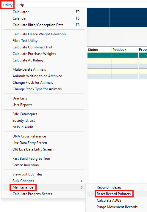 Utility > Maintenance > Reset Record Pointers
