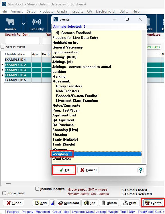 Stockbook allows for sale weights to be recorded. 1. Select the animals First select the animals that have been sold and you wish to enter a sale weight for. Then select Events > Sale/Death/Disposal > OK. 2. Enter details A date must be entered to ...