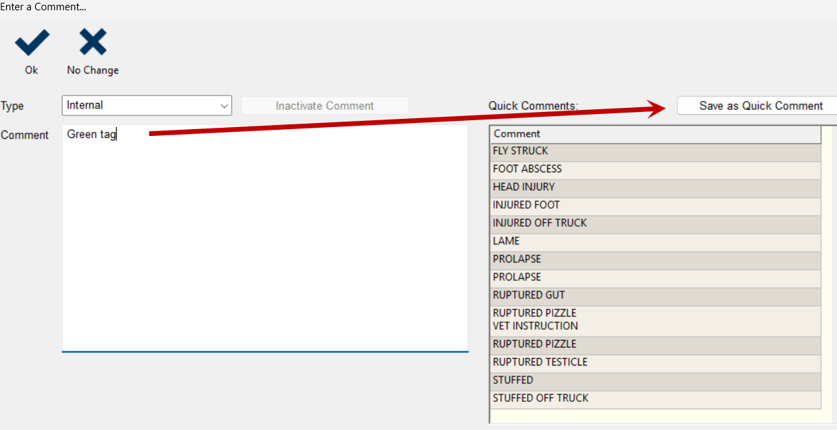 Saleyards and Agencies can create an internal comment not available in the Quick Comments by writing in the blank Comment field.