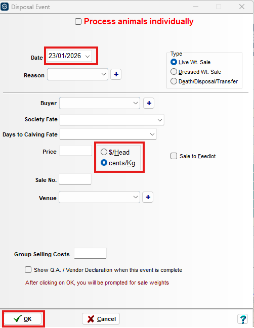 Recording a death/disposal or sale can be done from the Live Entry screen. Step 1. Click on the Setup > Data Entry Template menu option Step 2. Select Cull Reason Scroll down the list of available options and tick the Cull Reason box Click on the OK ...