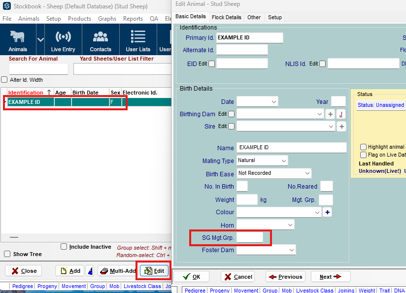 Setting the Sheep Genetics (SG) Management Group (Sheep) or Genetic Management Group (GMG - Cattle) for animals can be done individually, or in bulk.