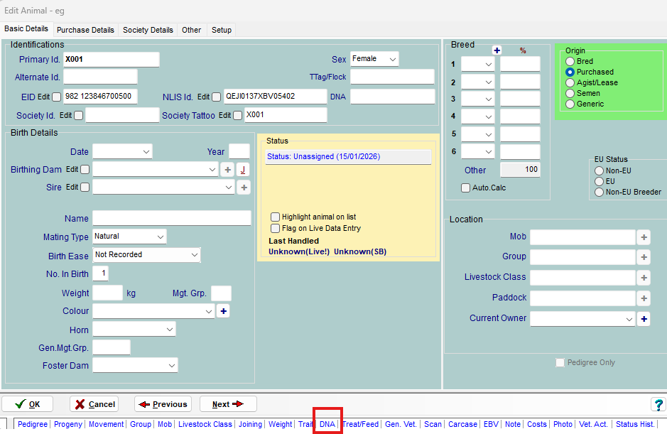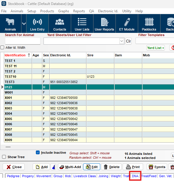 The DNA table is visible either in the main animal list or when you view/edit an individual animal.