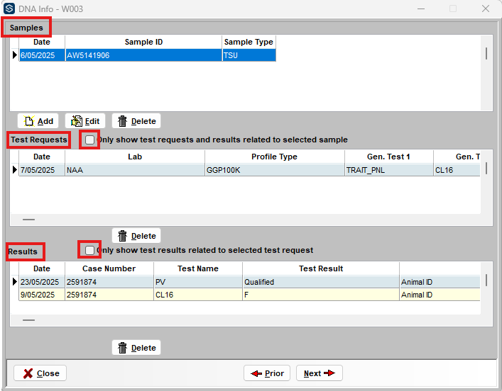 If you would like to only see test requests associated with the currently selected sample (in the DNA samples list) tick on "Only show test requests and result related to the selected sample".