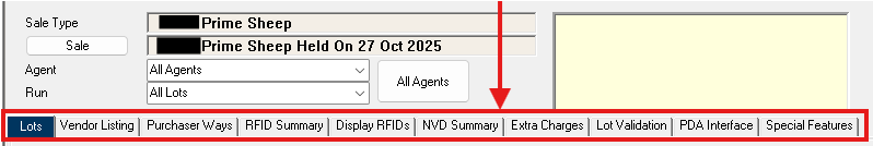 | Lots | All/filtered lots in the sale. Use Search For to find lots; filter by agent in saleyard mode. |