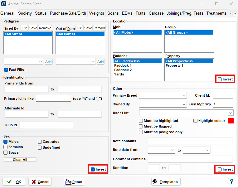 For example, if the Invert box in the "Sex" section is unchecked, only male animals are shown. When checked, it excludes male animals and shows all others.